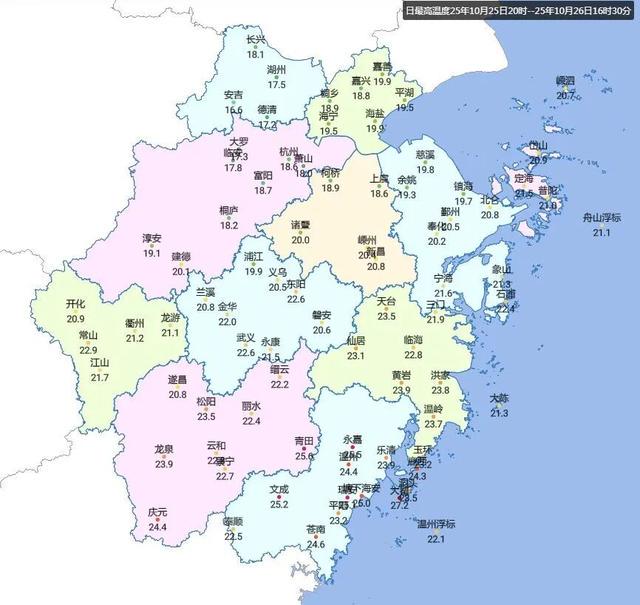 反观浙中南地区,昨天升温力度也不强烈,午后厚厚的云层挡住了升温的步伐,不少地区气温爬到20℃线以上也上不去了,最后上云的东南沿海地区气温最高,不少地区来到了25℃以上,其中青田最高,为25.6℃。